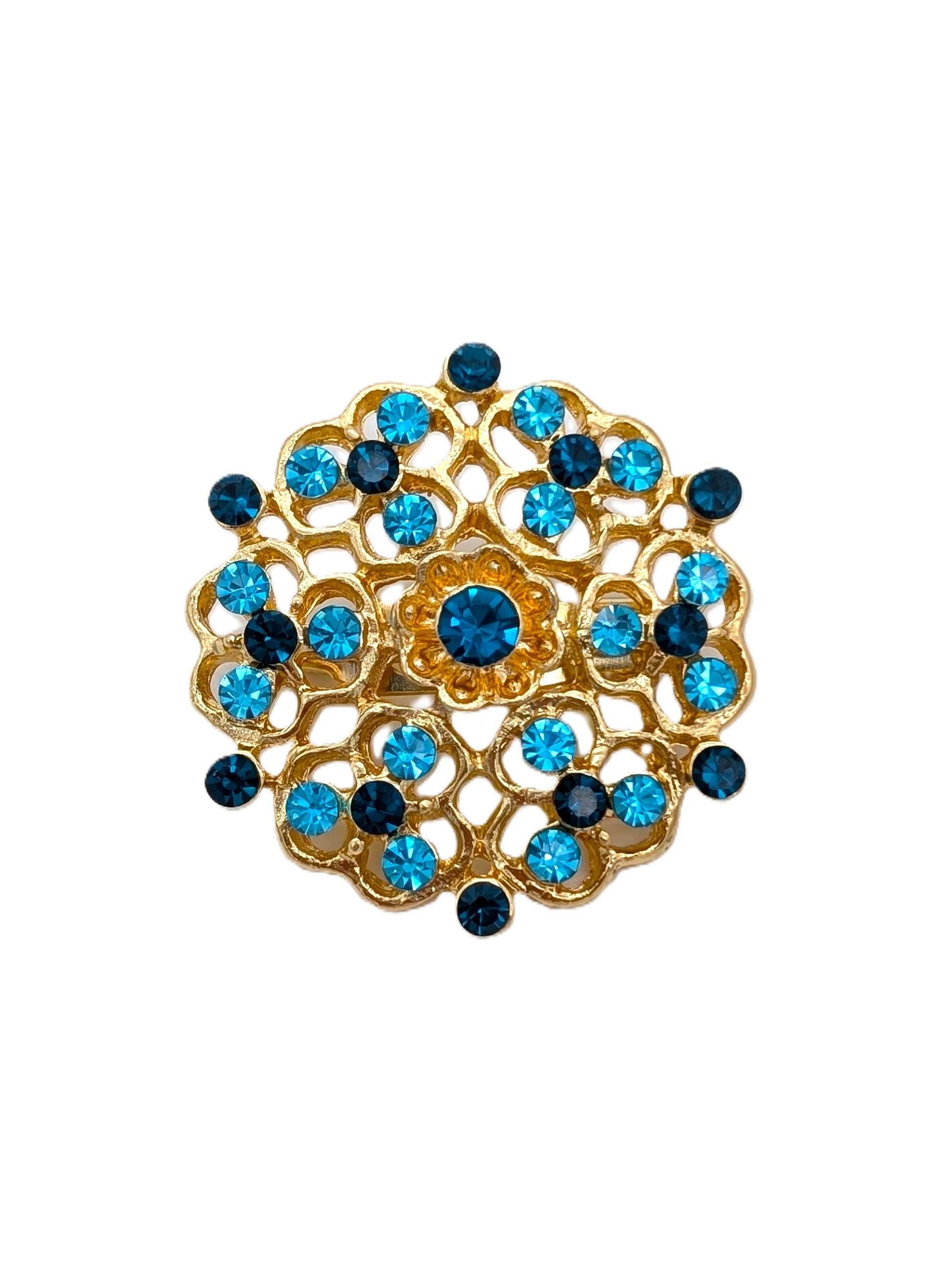 Adorn your ensemble with the cool, captivating tones of the Azure Medallion Brooch. Set in brilliant gold-tone filigree, this piece features a perfectly round mandala shape, reminiscent of classic vintage jewelry with its ornate, flower-like openwork design.