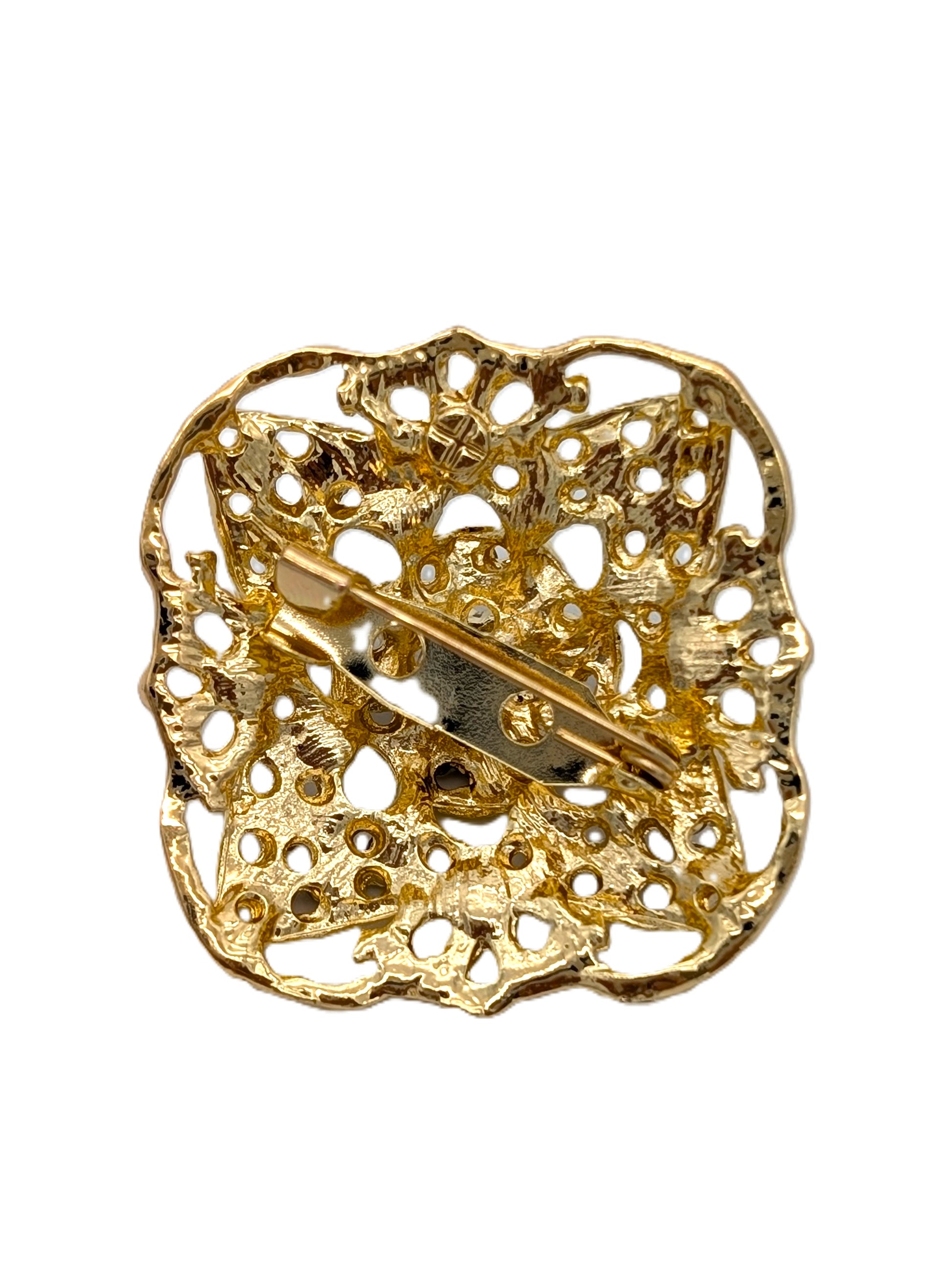 Make a distinct and refined statement with our gorgeous Copper Blossom Brooch. This elegant piece features a unique Rhombus silhouette with softly rounded edges, framing an intricate floral mandala design set in lustrous gold-tone filigree.