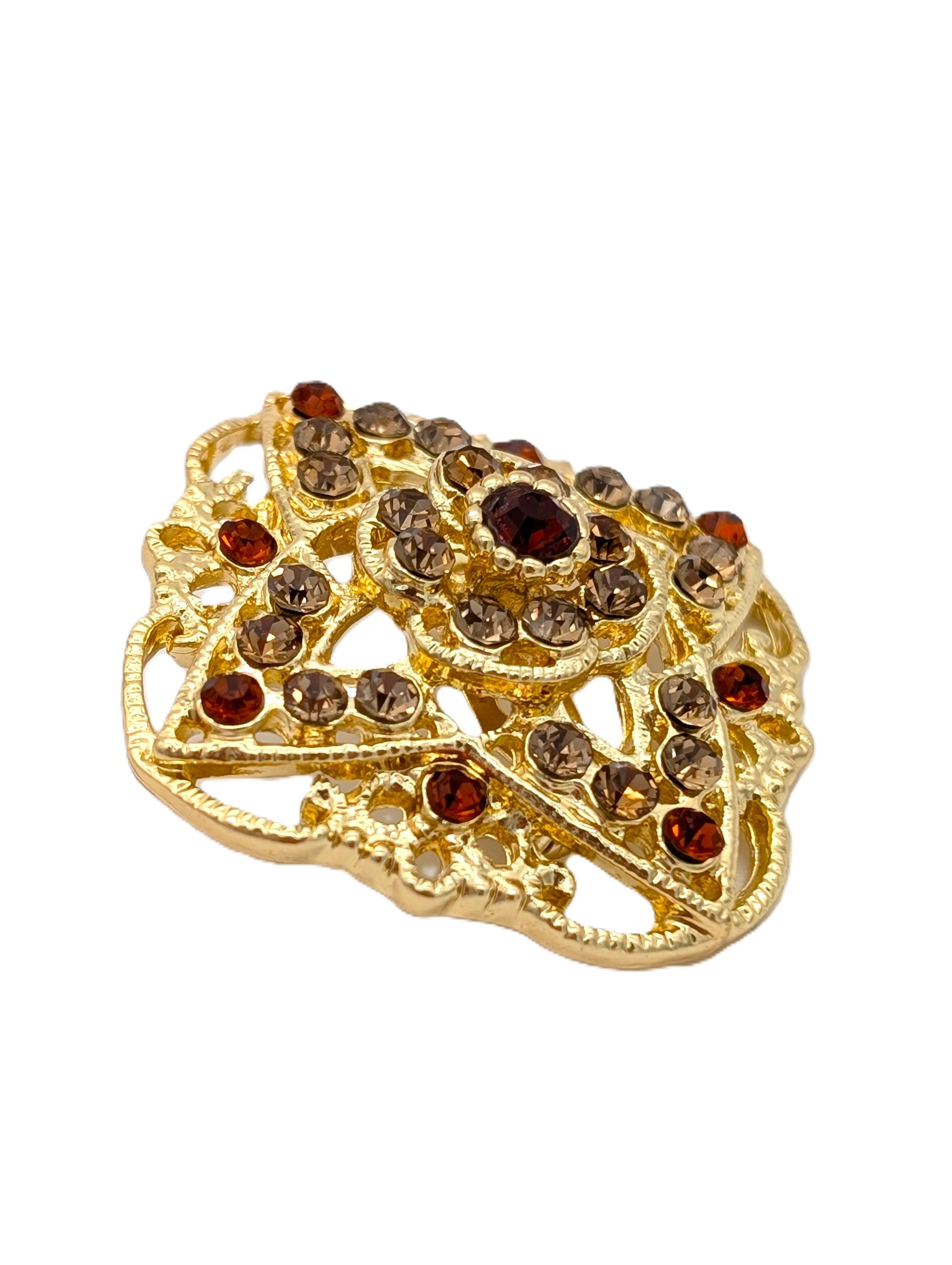Rich Gemstone Detail: The brooch is beautifully adorned with a harmonious blend of crystals: deep, earthy ruby-red stones 🌹 and shimmering copper-brown accents. This warm, luxurious combination is perfect for complementing both casual and formal autumn/winter attire.