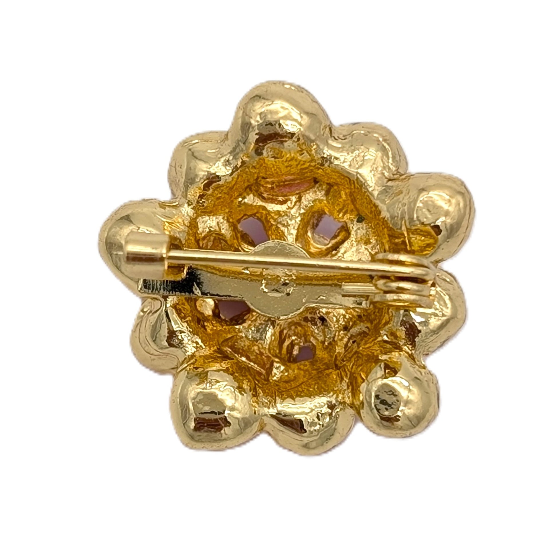 Jewel-Toned Radiance: Set in a classic gold-tone metal, the pin features a dense, multi-faceted flower or cluster motif. It is richly adorned with a stunning mix of crystals: deep, vibrant fuchsia stones and luminous rose accents. This feminine and lively palette is perfect for brightening any look.
