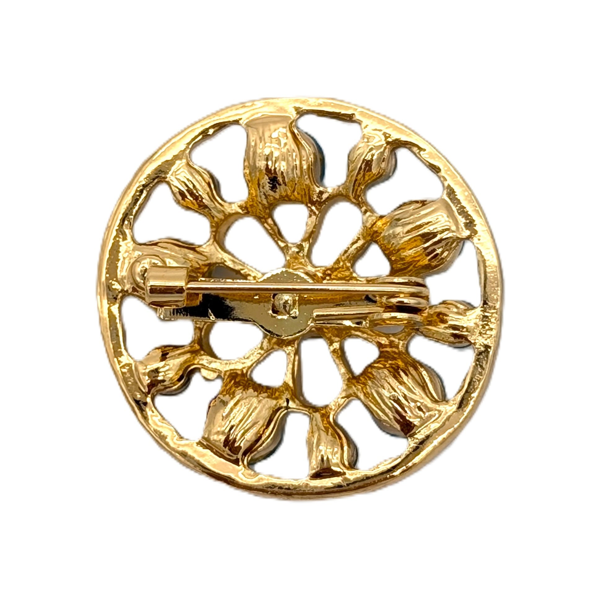 Design: Delicate floral motif in a round setting, ideal for pairing with other pins or adding a focused accent.