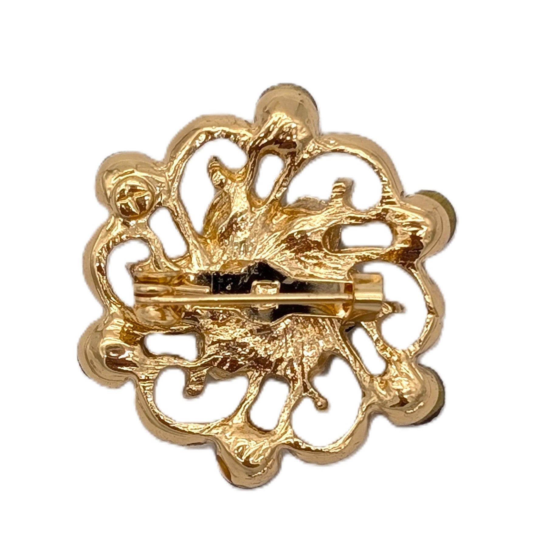 Unique Design: The pin is shaped like a delicate, stylized blossom or rosette. Its gold-tone setting is exquisitely detailed with lacy filigree scrolls and ornate metalwork, giving it a rich, high-quality, antique feel. ✨