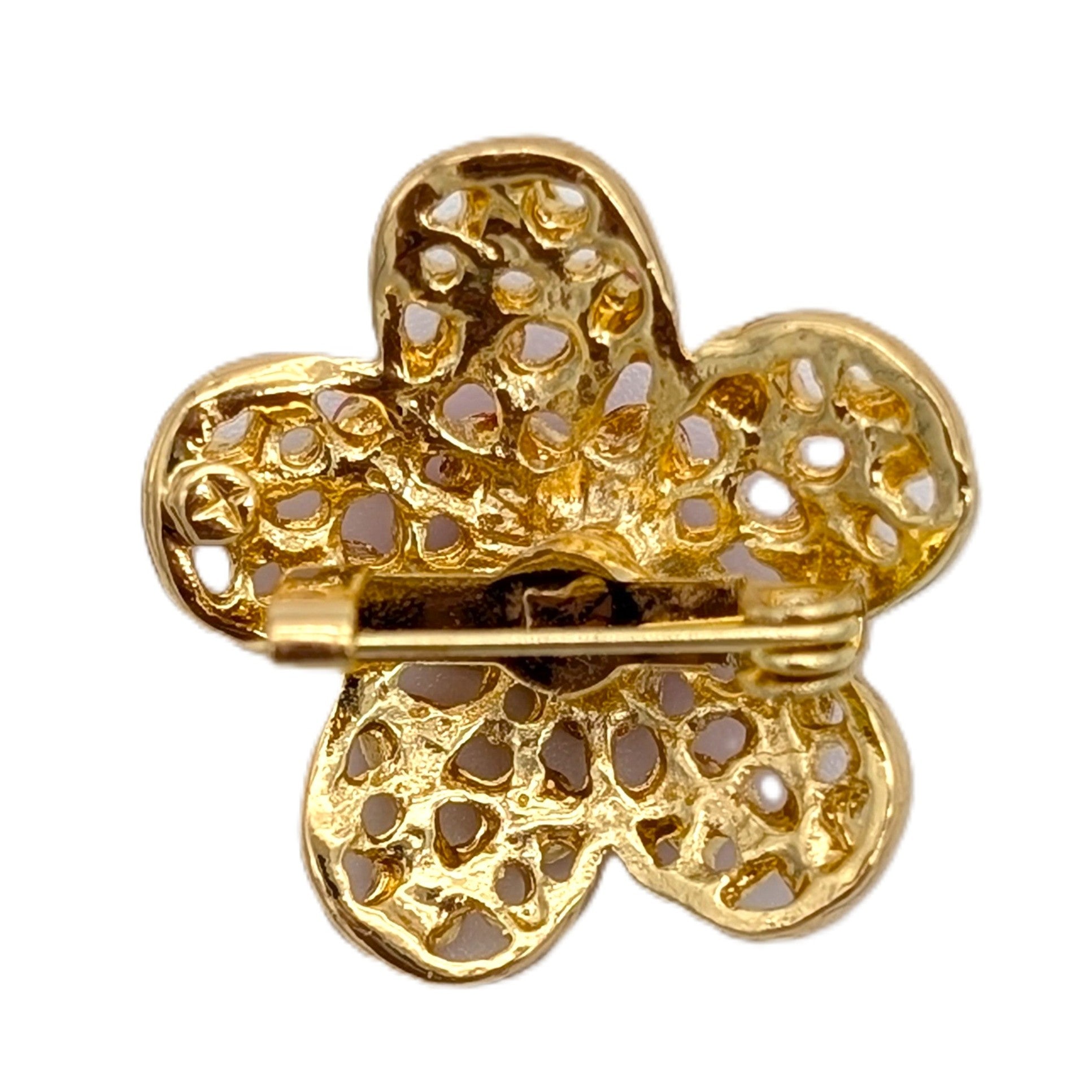 Pretty in Pink Design: Set in a classic gold-tone metal, this pin features a delicate five-petal flower silhouette with intricate openwork. Each petal and the central cluster are beautifully adorned with a harmonious mix of light pink and vibrant fuchsia crystals, creating a joyful and radiant effect.